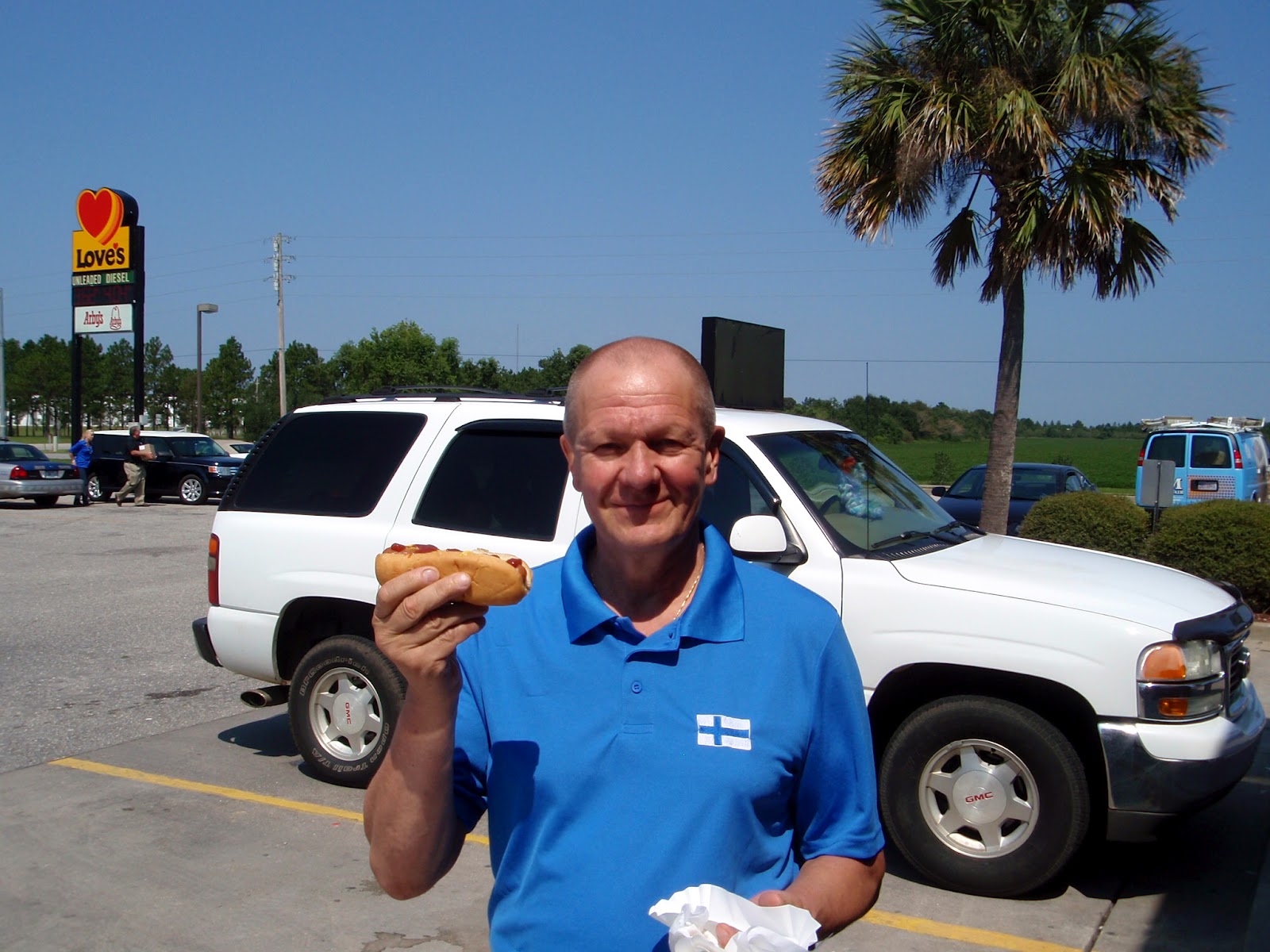 Kaksi episodia kuitenkin ennen herkuttelua. Minulla oli kaupassa päälläni T-paita, jossa on rinnuksessa sama valokuva, kuin tämän blogini etusivulla, siis kartta ajamistani reiteistä USAssa. Kalatiskin myyjä äkkäsi sen ja halusi tulla lähempää katsomaan missä kaikkialla olen käynyt. Siinä loppui kalanmyynti hetkeksi, kun juttelimme 10 minuuttia paidan reiteistä ja ihmisiä kertyi ympärille ja yleisin kommentti oli ”OH MY GOOD”. Selvittiin kumminkin kunnialla kämpille ja paitani pysyi ehjänä. Kämpillä huomasimme, että kassi, missä oli kertakäyttölautaset ja puolikas sipsipussi oli kateissa. Olimme molemmat sitä mieltä, että me emme hukkaa tavaroita (Marjalta ei nyt haluta kommenttia tähän) ja etsimme niitä raivoisasti joka paikasta. Ei löytynyt, joten sinne se on jäänyt edelliseen motelliin. Minä hyppäsin autoon ja ajoin hakemaan uudet lautaset ja sipsit.